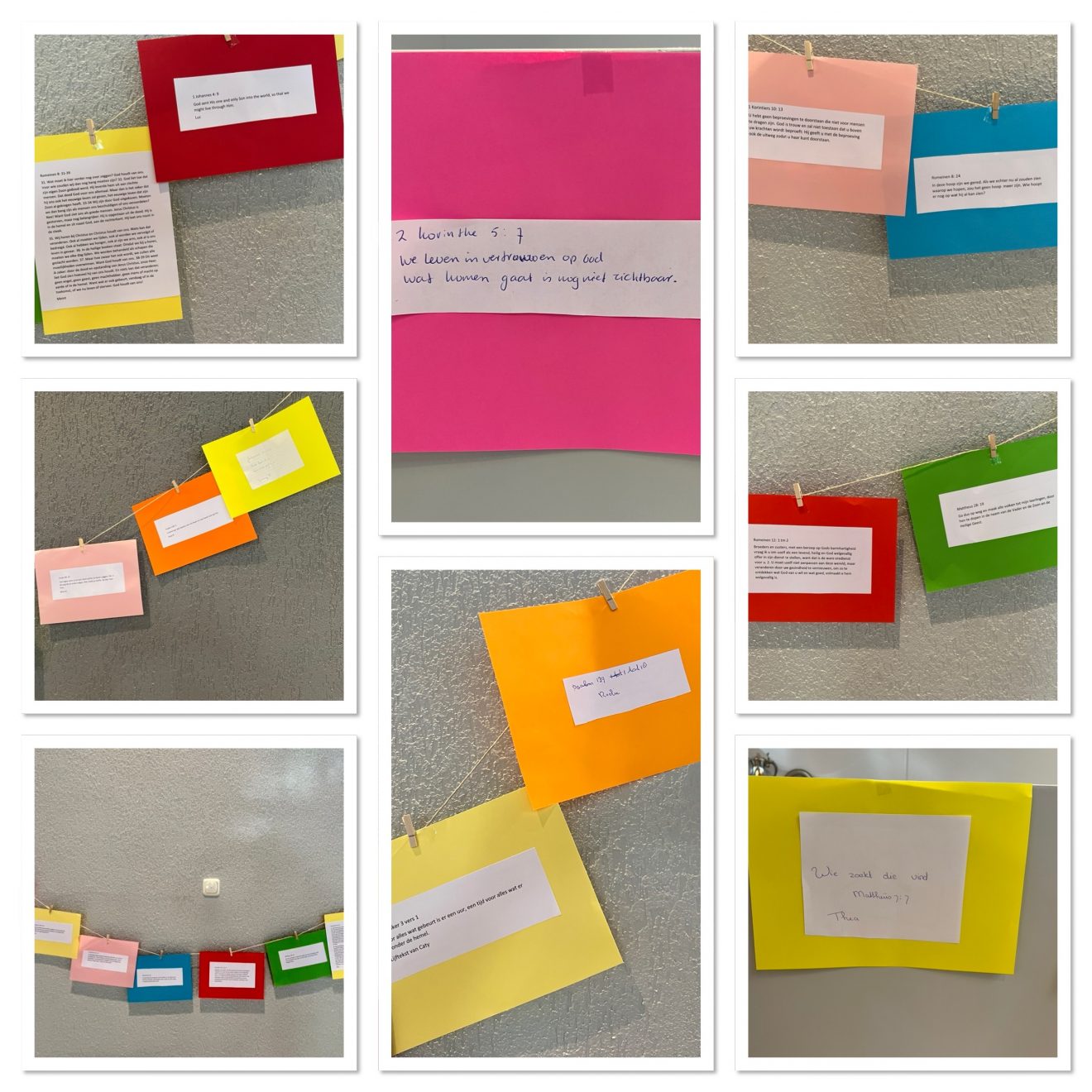 Hier hebben we vele mooie reacties op gehad. De bijbelteksten zijn allemaal opgehangen in de kerk en tijdens de dienst is er aandacht aan besteed. Na de dienst was er de gelegenheid om deze teksten nog even rustig na te lezen